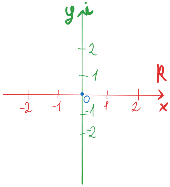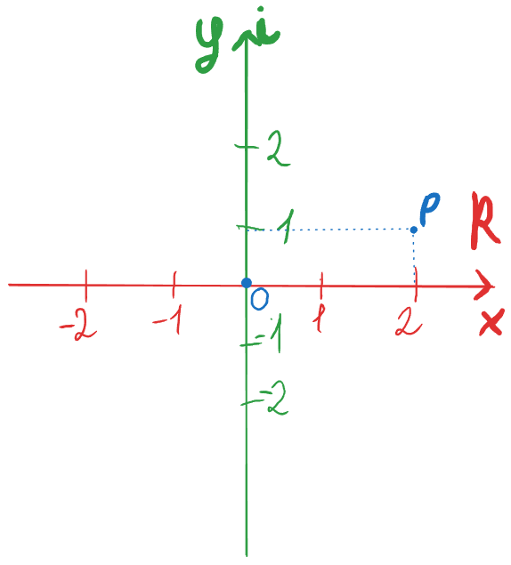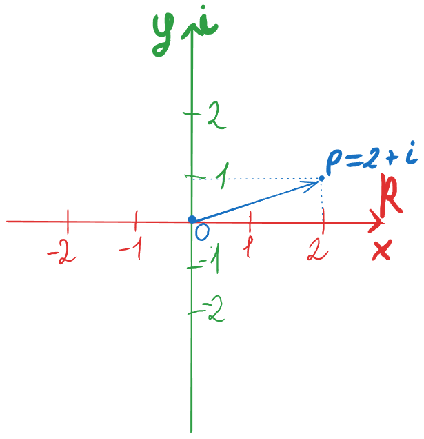 Як бачимо, на осі дійсних чисел у нас додатнє число 2. На осі уявних чисел у нас додатнє число 1i (1 можемо не вказувати). Отже можемо записати координати точки як: