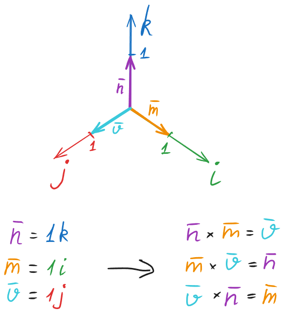 Аналогічно і в гіперкомплексних числах: якщо ми здійснюємо операцію множення двох векторів, що знаходяться в гіперкомплексній площині, то в результаті отримаємо третій вектор, перпендикулярний до попередніх двох: