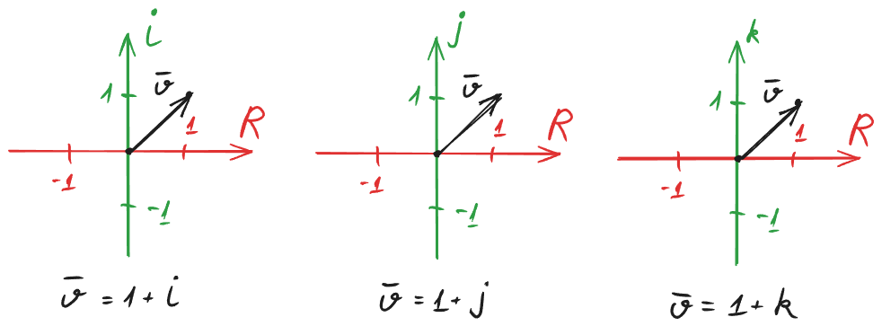 Знаючи властивості комплексних чисел, виникає запитання, а як ми можемо здійснити обертання в просторі, якщо у нас, наприклад, i² = -1 але осі з дійсними числами на площинах нема? До цього повернемось трохи пізніше. Зараз розглянемо нові властивості, що у нас зʼявились із таким підходом:
